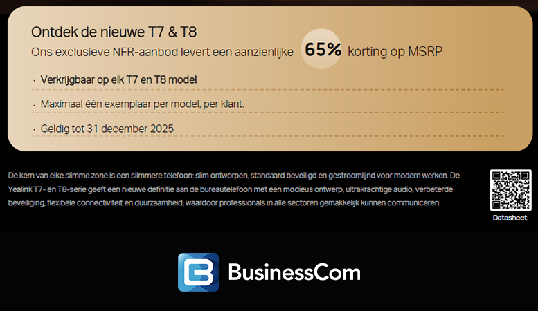 We hebben goed nieuws voor iedereen die zijn portfolio wil versterken met de nieuwste generatie Yealink IP-telefoons. Er loopt nu een exclusieve NFR-actie waarbij je kunt profiteren van maar liefst 65% korting op de populaire Yealink T7- en T8-serie. Een perfecte gelegenheid om deze toestellen uitgebreid te testen binnen je eigen organisatie.